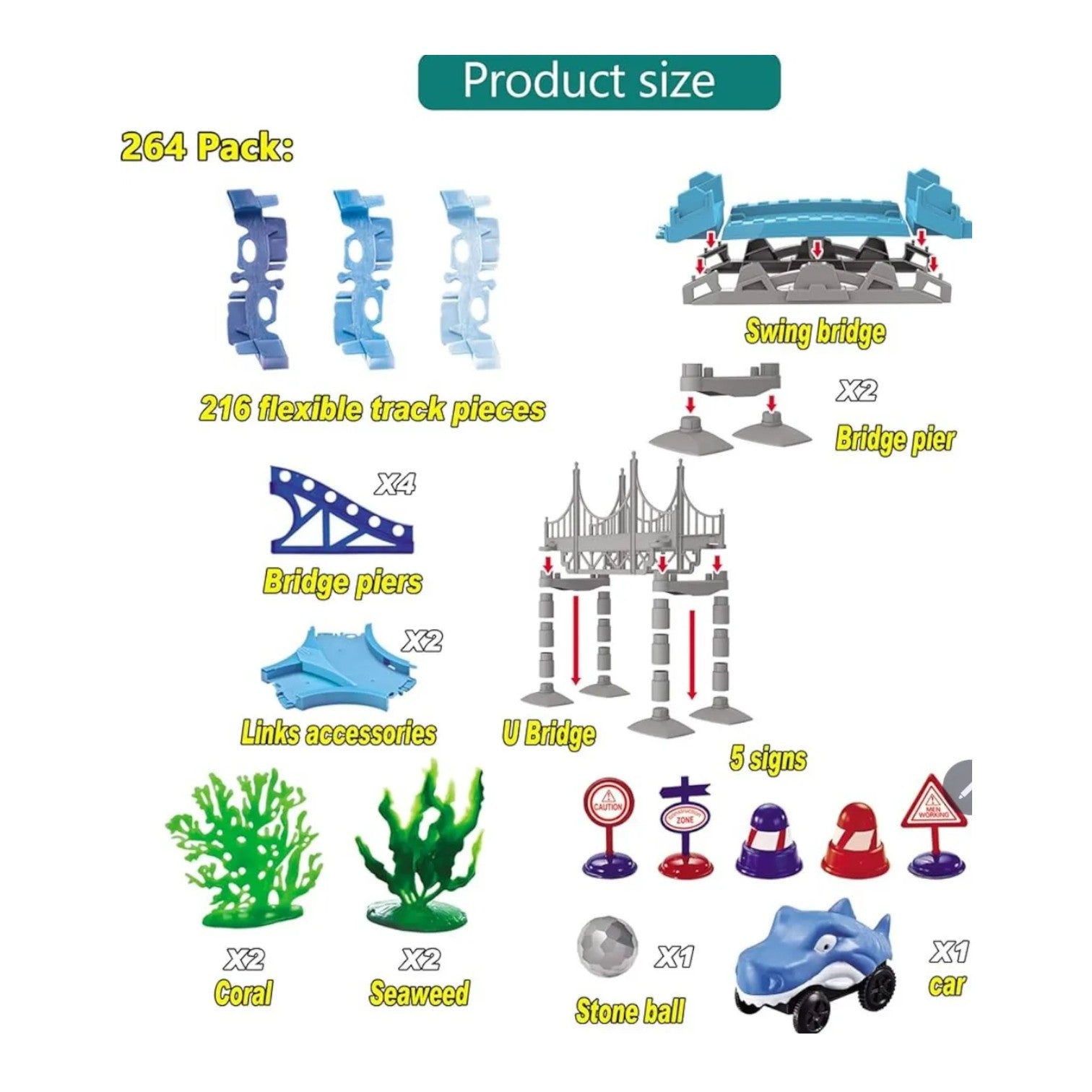 - Elementos: pista flexible, autos eléctricos, puente, señales, palmeras, accesorios y figura de tiburón.